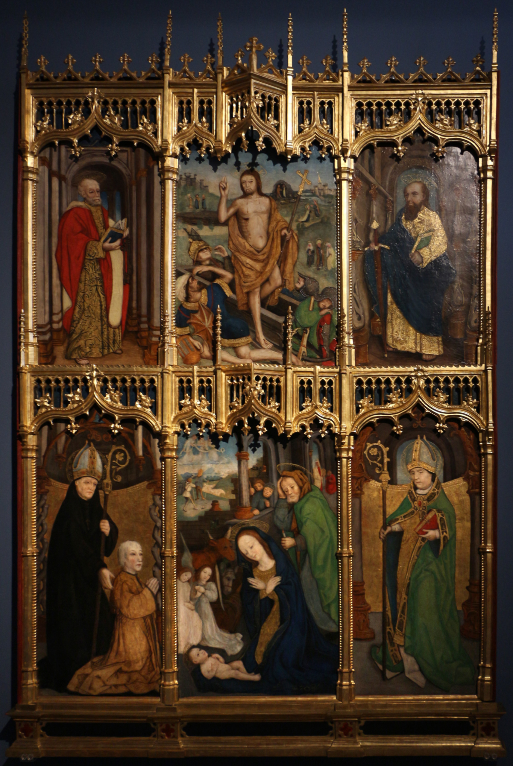 (Sant’Eldrado con committente Andrea Provana, Natività, Sant’Arnulfo, registro principale; San Pietro, Resurrezione, San Paolo, registro superiore)